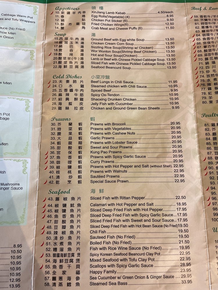 Lamb (or beef) with pickled cabbage warm pot, beans with salted vegetables with tofu wrappers. Lamb with green onions. Sliced fish with hot bean sauce (no fried), house special dough sliced chow mien. Sesame pancake with green onion, steamed rice.